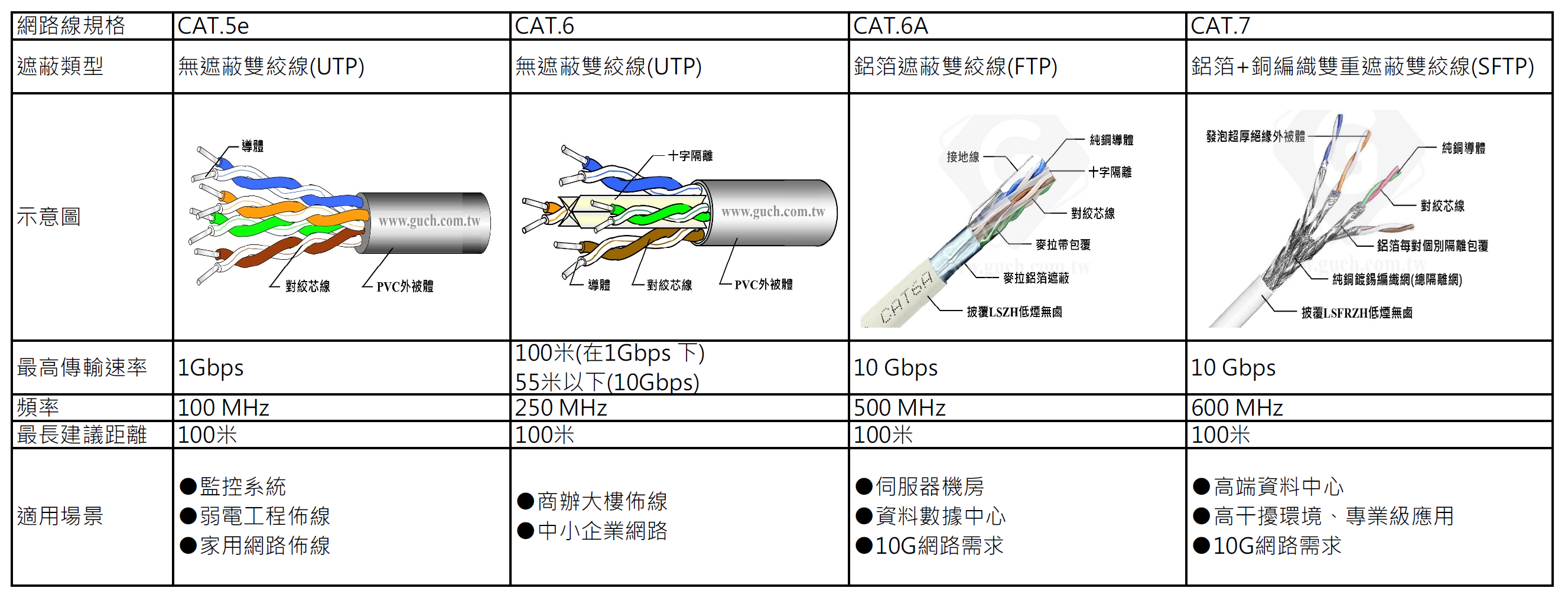 其中CAT.5e,代表第5類的增強型,而CAT.6 以上則是因為結構不同,擁有較高的頻寬、抗干擾性佳,與數據傳輸速度較快的能力,而被廣泛應用。