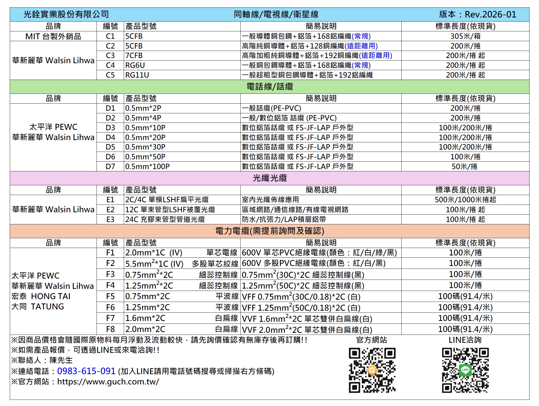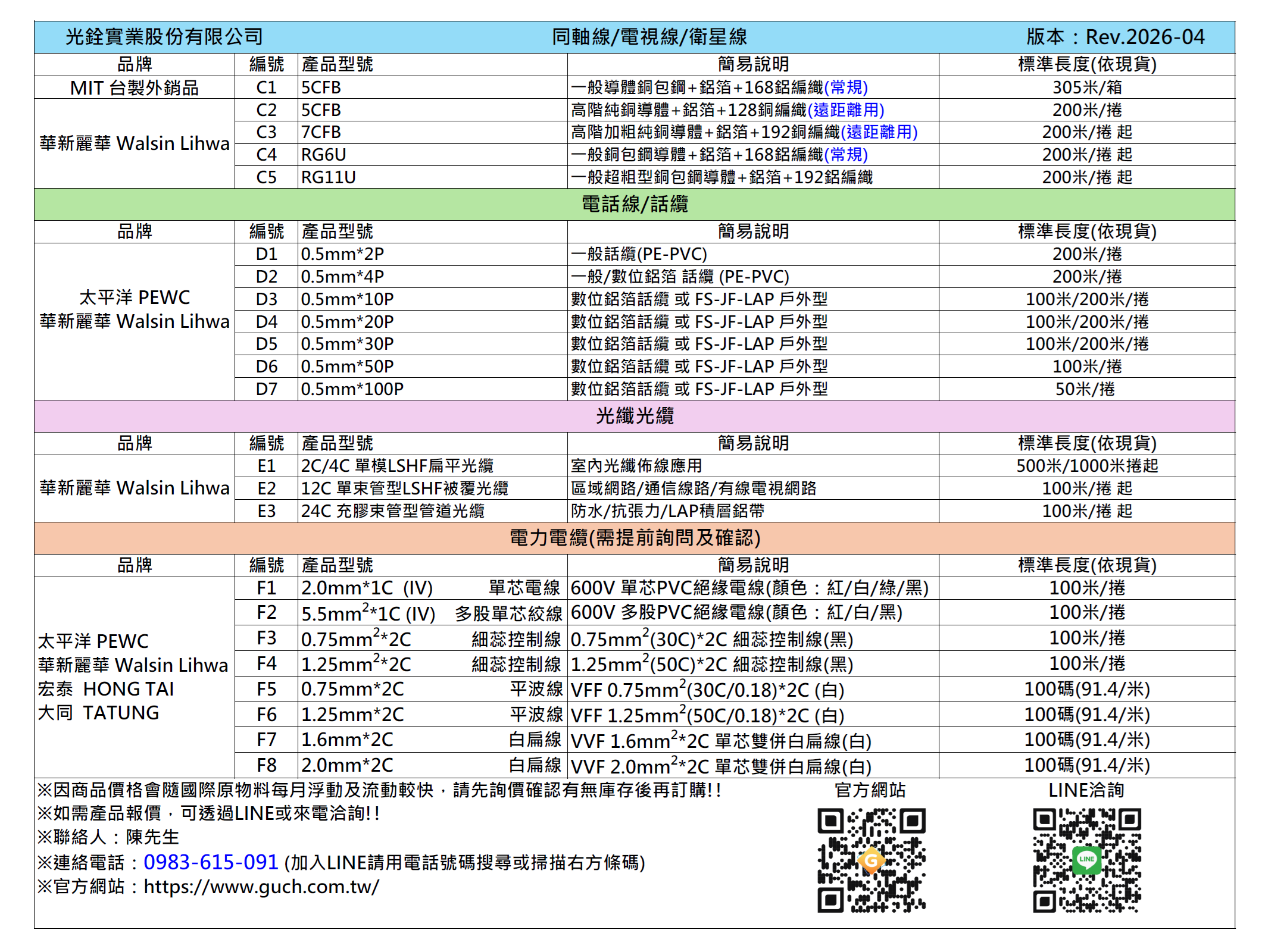 光銓實業-同軸&電話線&光纖 銷售總表